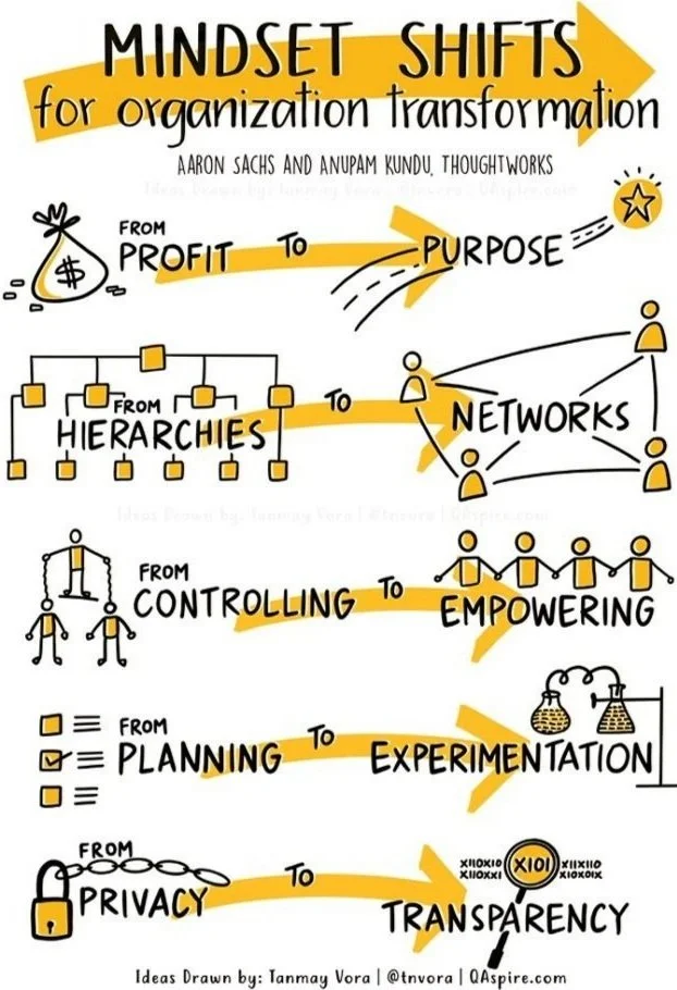 Aaron Sachs y Anupam Kundu han escrito un excelente post donde describen los cambios de mentalidad necesarios para que nuestras organizaciones sean más adaptables y ágiles. Tanmay Vora nos regaló una facilitación gráfica maravillosa de ése post.
